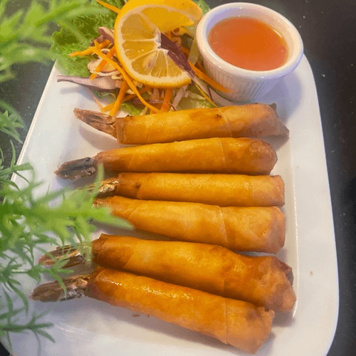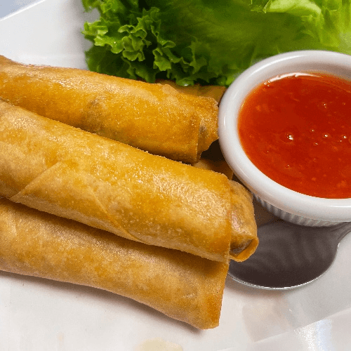 Golden fried egg rolls filled with Cabbage, Carrot, Celery, Glass Noodle serve with Sweet and Sour Sauce.