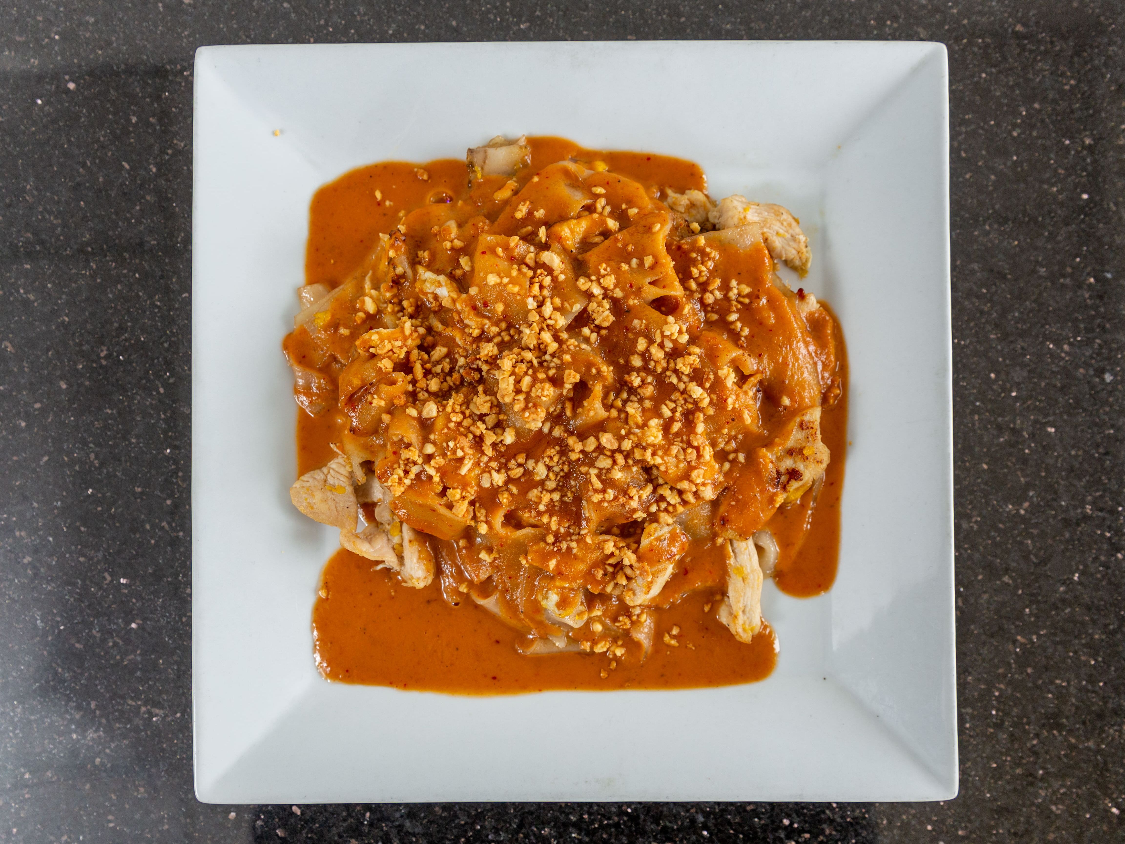 Pan fried wide rice noodles with egg, and your choice of meat topped with peanut sauce.