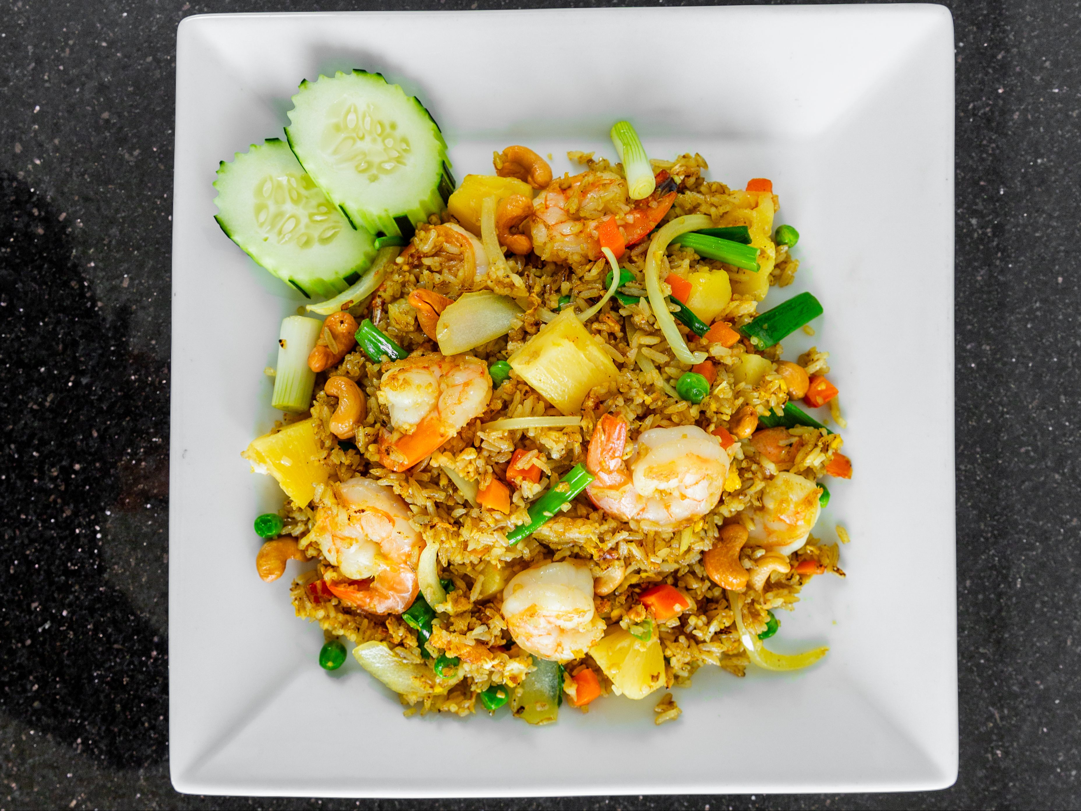 Pan fried jasmine rice wiith egg, onions, green onion, peas, carrots, pineapple, cashew and curry powder.