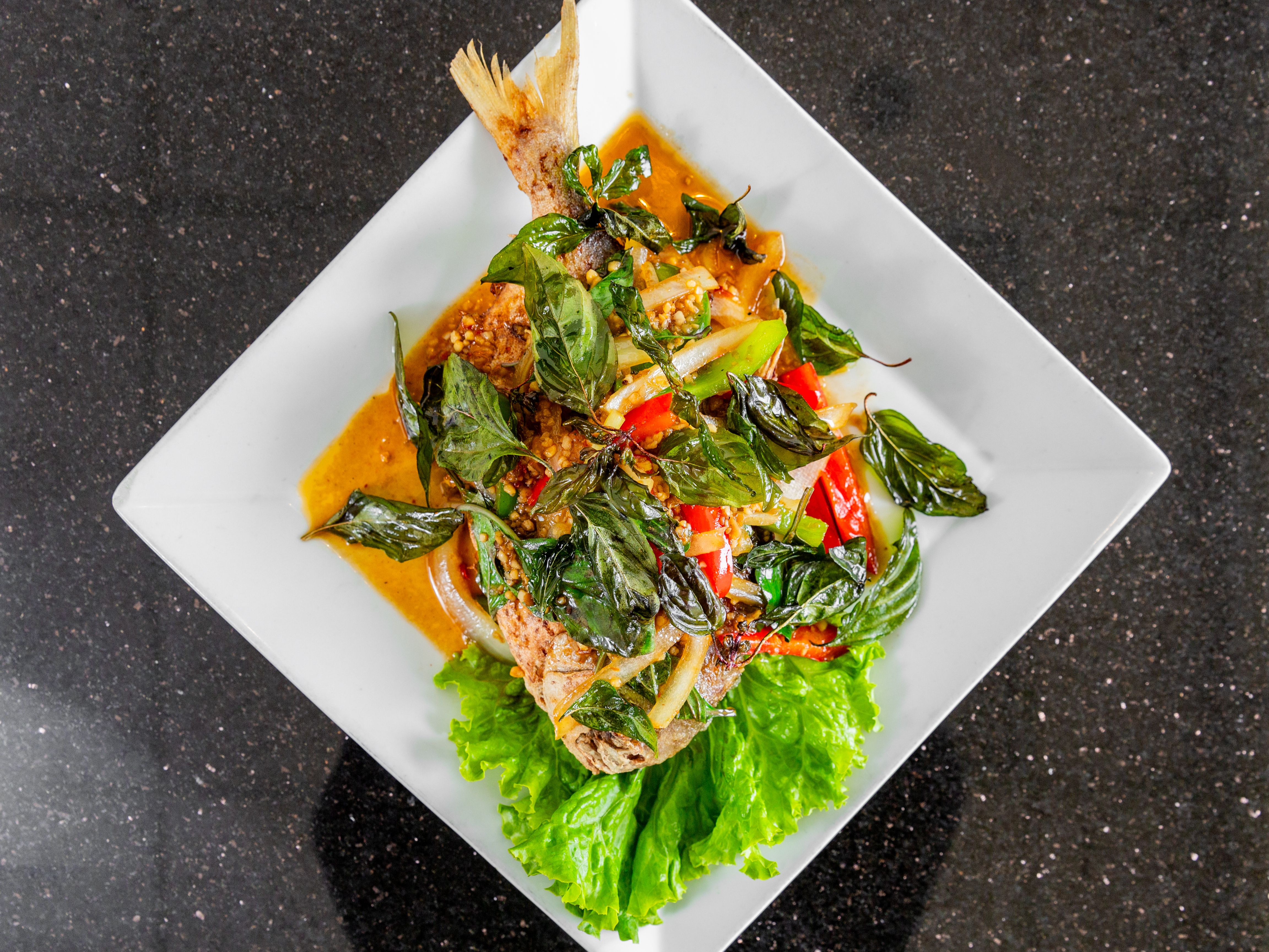 Deep fried Whole Fish Topped With Bell Pepper, Onions, Green Beans, And Carrots in Garlic Basil Sauce Served With Jasmine Rice