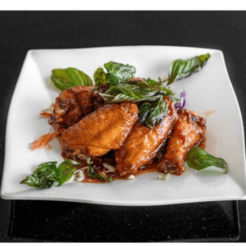 Deep Fried Chicken Wings With Our House Sweet And Spicy Chili Sauce Topped With Fried Thai Basil.