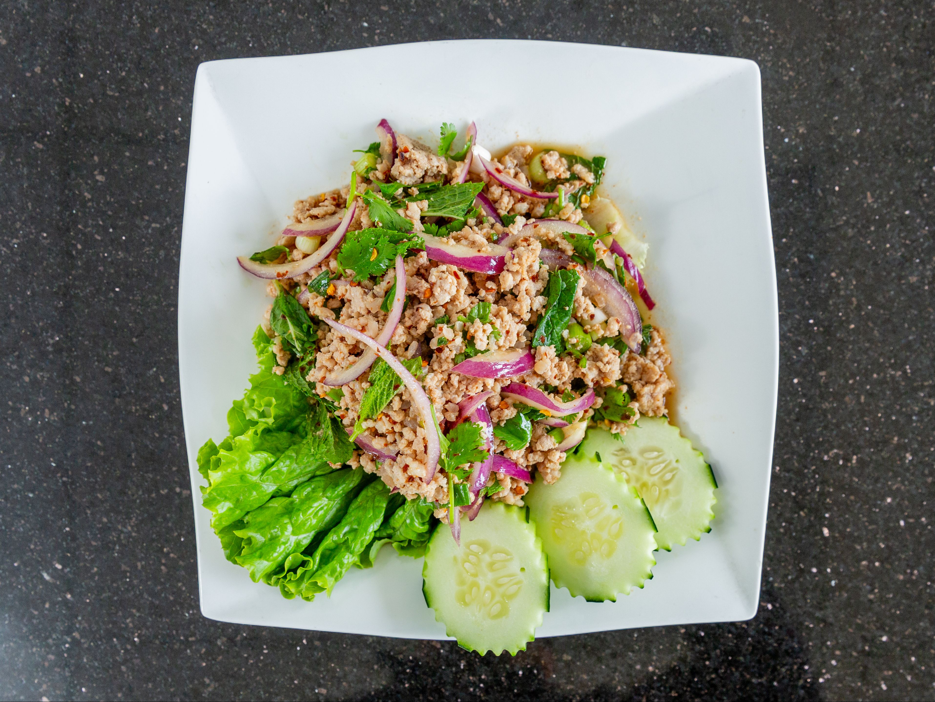 Choice of ground pork, ground chicken or ground beef tossed in red onions, mint, Cilantro and rice powder mixed with Fish Sauce and Lime Dressing. Served with fresh cucumber.