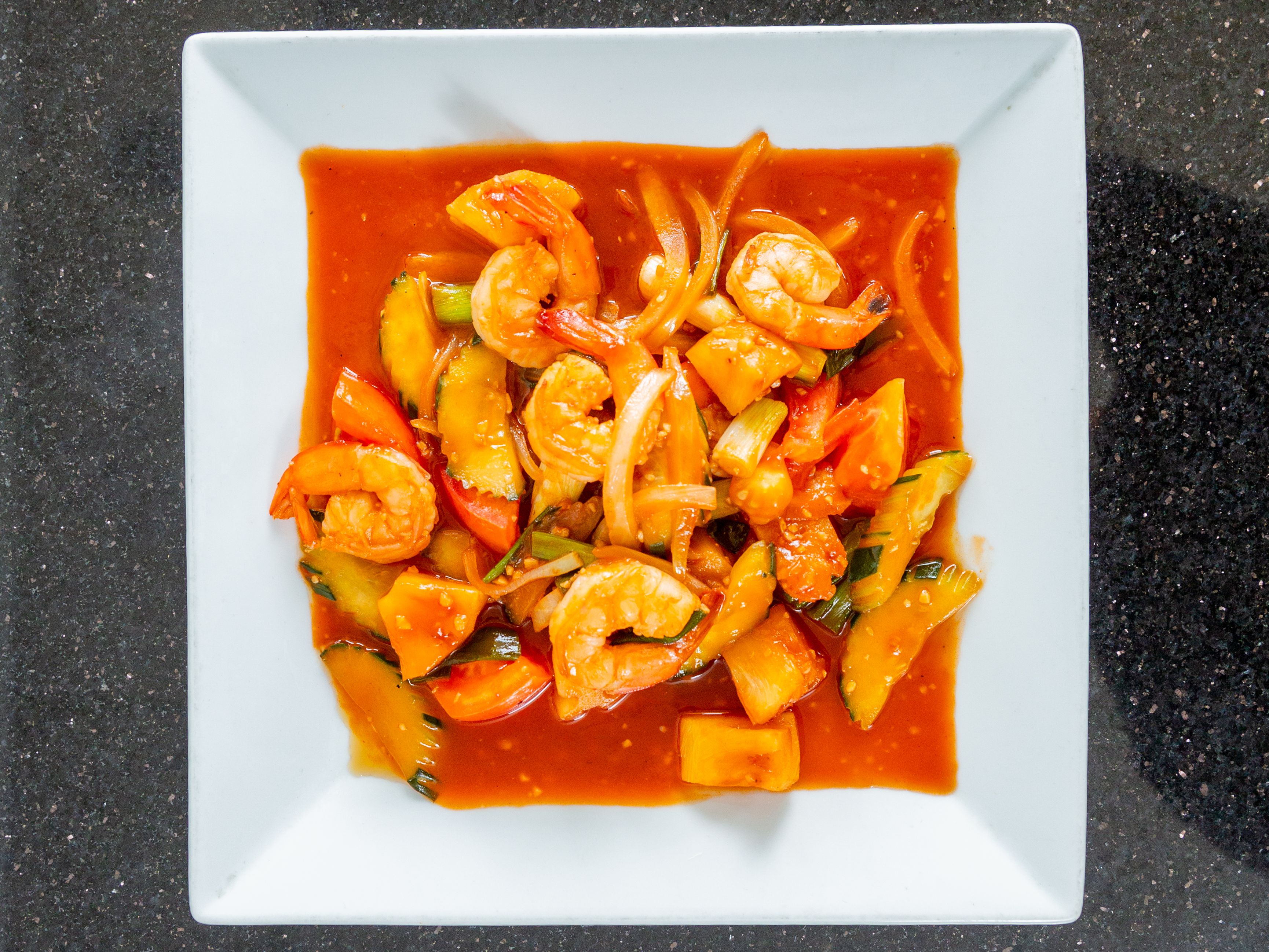 Stir fried Cucumber, pineapple, tomatoes, white and green onion in our house sweet and sour sauce.
