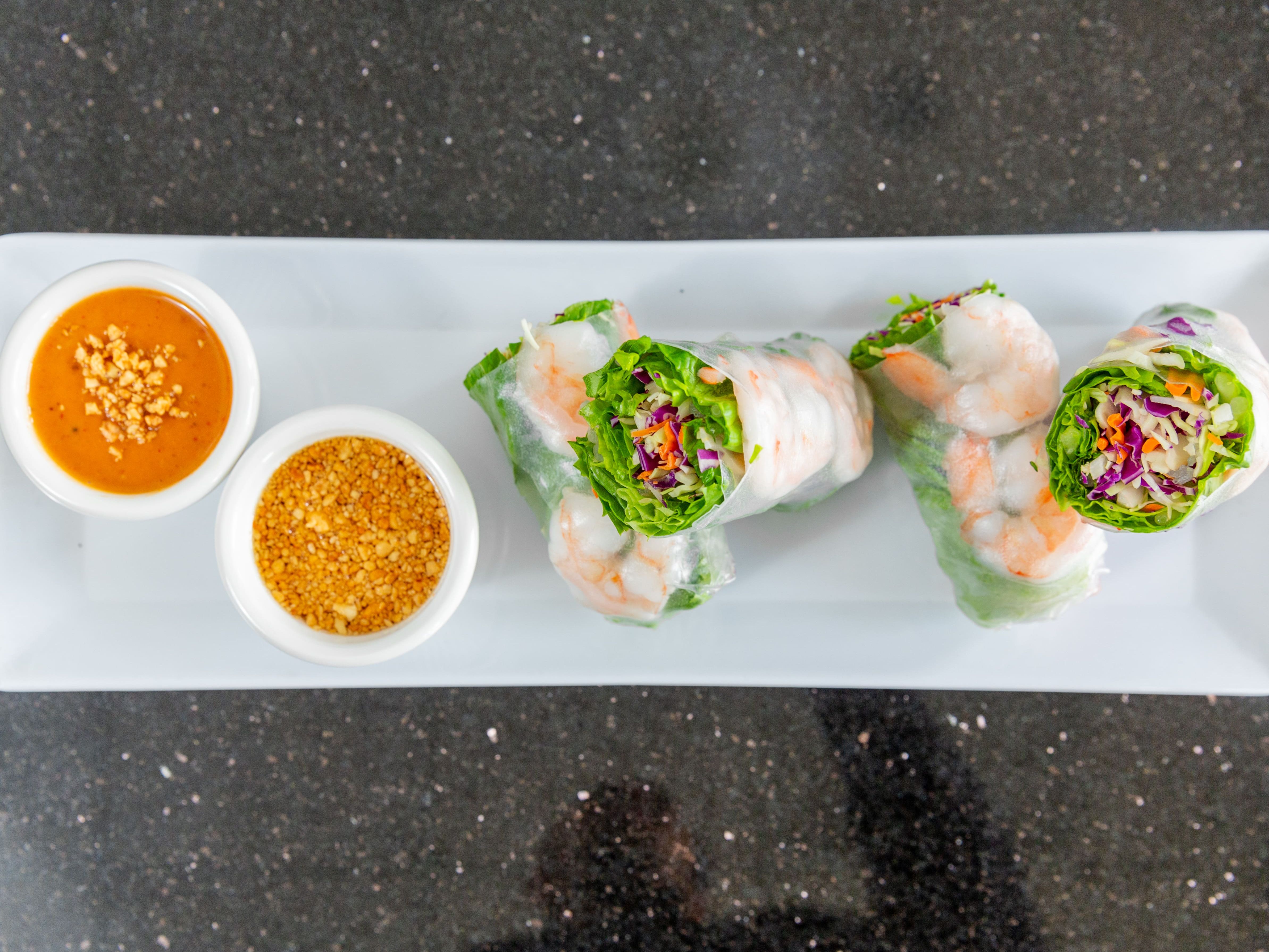 Rice paper wrapped with Lettuce, Cabbage, Carrot, Cucumber, Cilantro,Mint,Bean Sprouts and Rice Noodle serve with Homemade Peanut Sauce. Your choice of Tofu or Shrimp +$ 1
