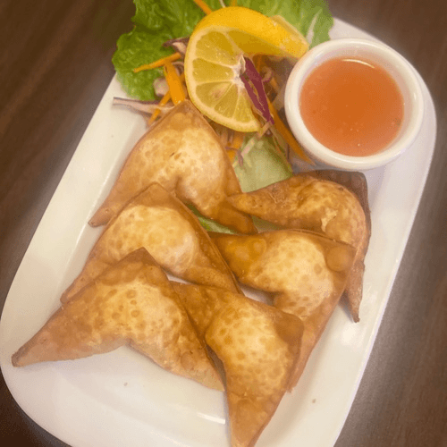 Deep Fried Wonton filled with Cream Cheese, Imitation Crab, Onion, Carrots and Celery served with Sweet and Sour Sauce.
