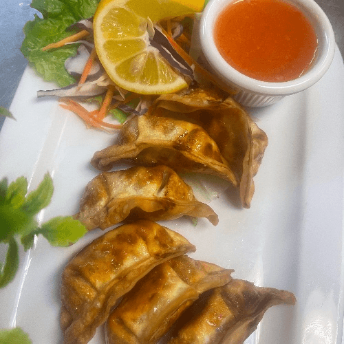 Deep Fried Pork and Vegetable Pot Stickers serve with Sweet and Sour Sauce.