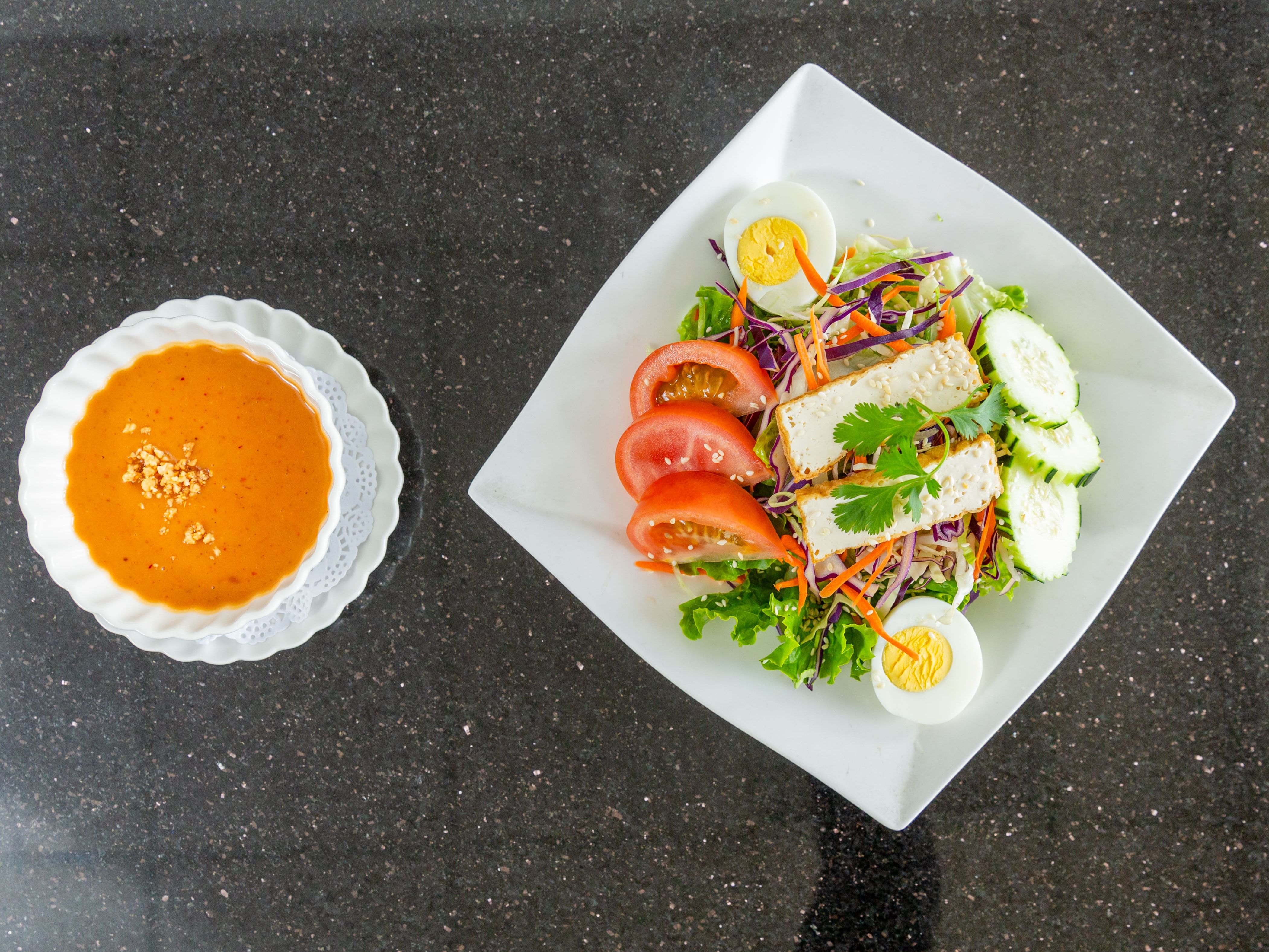 Bed of fresh Lettuce, Iceberg, Carrot, purple cabbage, Cucumber, Tomatoes, Fried Tofu, topped with hard boiled egg. serve with Peanut Dressing.
