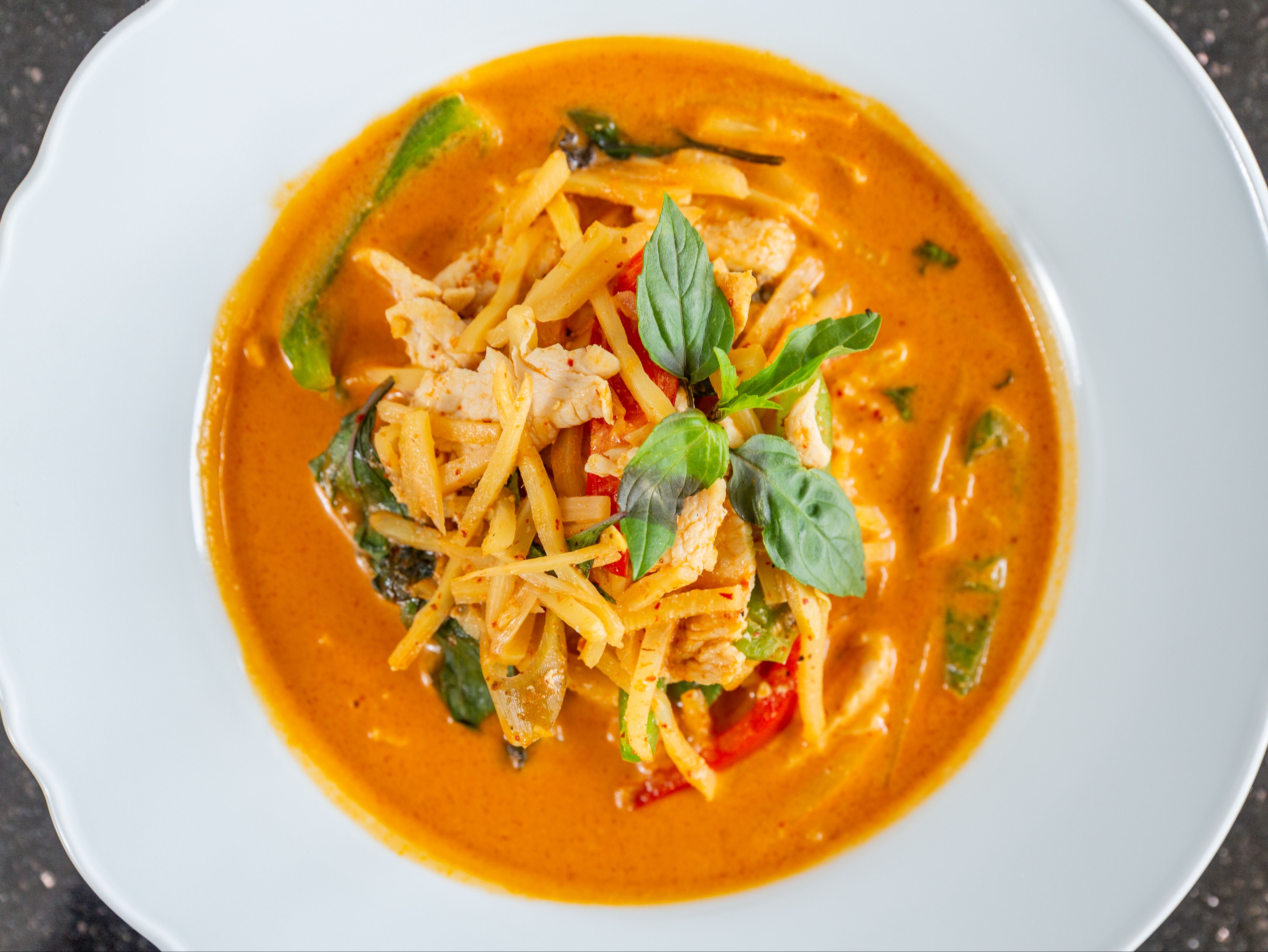 Simmered red curry in coconut milk with bamboo shoots, bell peppers, and Thai basil.