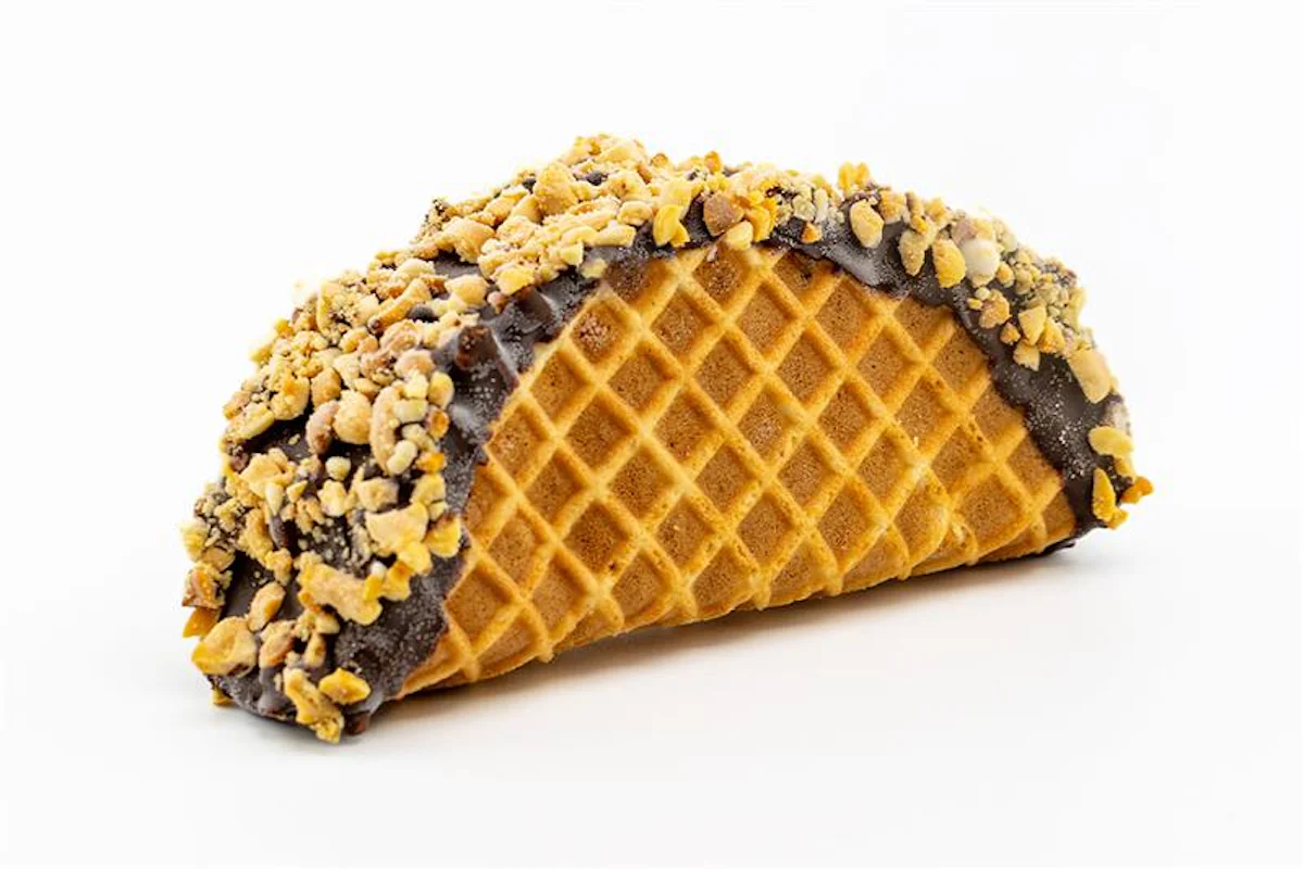 Sweet Cream Ice Cream wrapped in a waffle taco and coated with Chocolate and Peanuts.